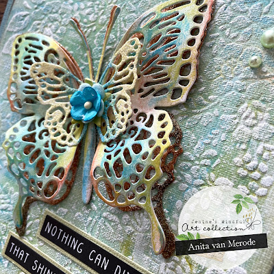 De vlinder heb ik weer op kleur gebracht met Distress Crayons.